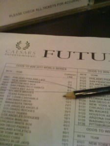 Most years the odds hovered around the 10-1, 15-1 range. Except in 2010. I couldn’t tell you what the preseason odds were for the Giants to win it all last year, because I didn’t make my bet. And neither did Nelson. 2010 marked the first time since we had both come of age that neither one of us made the symbolic wager. I didn’t go to Tahoe last year. Nelson’s been busy. No big deal.