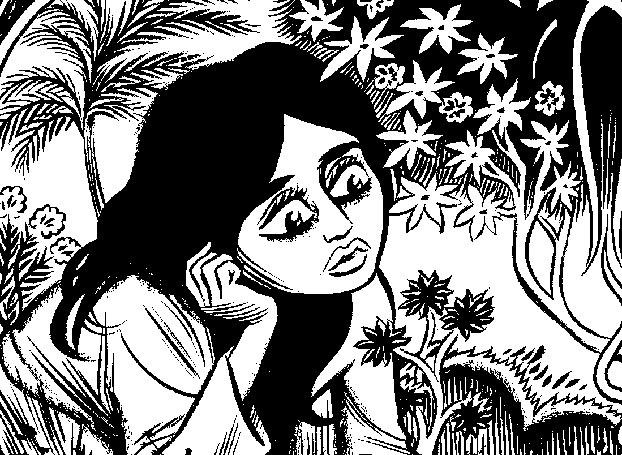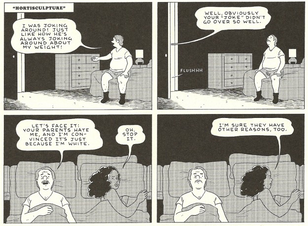 We’re treated to two main stories in this issue, the first being a black-and-white tale of an artist and his unusual struggle entitled “A Brief History of the Art Form Known as Hortisculpture.” Tomine brilliantly serializes the story using four-panel comic strips, each complete with its own punchline, but each intrinsically tied into the overall tale. The artistic style adopted for this particular story is also reminiscent of relationship-themed newspaper strips, falling somewhere between Blondie and Hi and Lois. I credit my grandfather with an incidental introduction to four-color superhero fantasy, but my earliest memories of comics involve my mom passing the funnies section to me over the breakfast table every morning. For Better or Worse was her favorite.