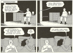 The full-color “Amber Sweet” is more of a signature Tomine piece. Sad, but beautiful, rendered with his distinctively clean lines, it tells the story of a girl forced to deal with the very unfortunate fact that she bears a striking resemblance to a well known porn star.