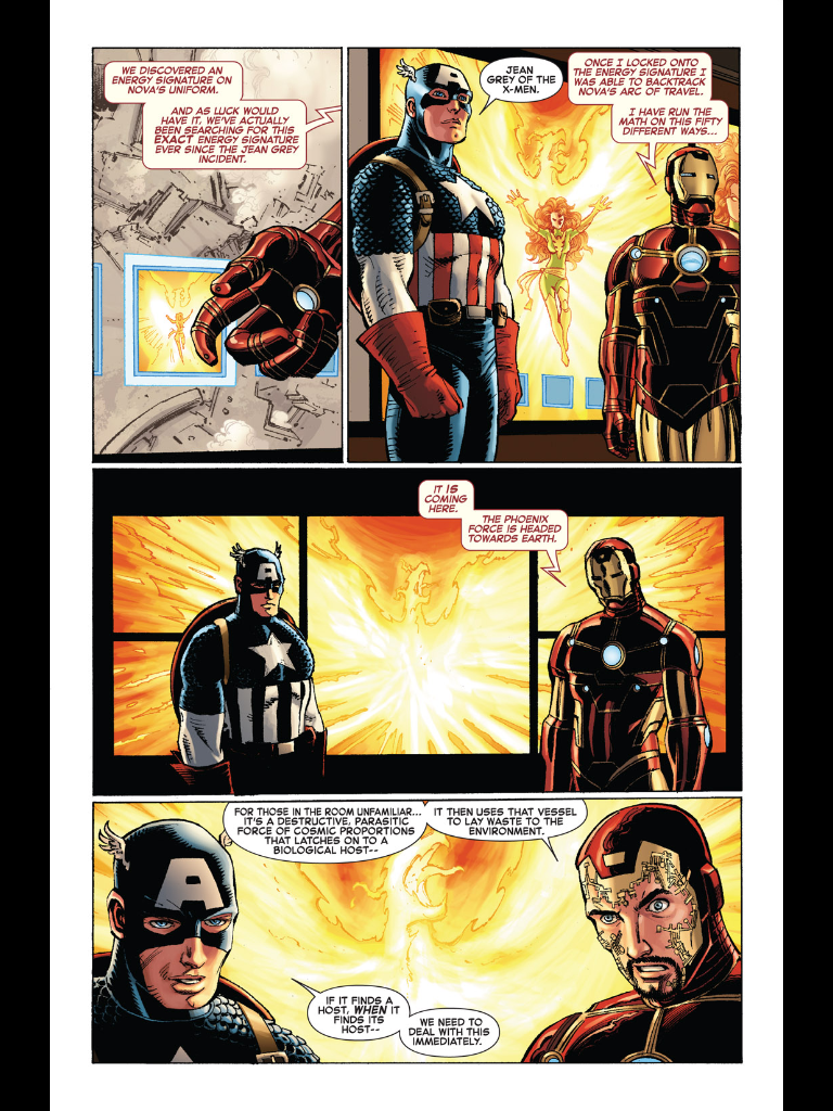 Whether you were onboard for Dark Phoenix in the 80’s, privy to the cartoon rendition in the 90’s, or were introduced to the Jean Grey drama via Famke Janssen’s tragic end in X-Men: The Last Stand, you know something about this Phoenix business. Chris Claremont and John Byrne created what is arguably the greatest Marvel storyline ever when they sent the X-Men on the now-classic adventure from the depraved ballrooms of the Hellfire Club in New York City to the cosmic grandiosity of the Shi’ar Imperium. No matter which version you’re accustomed to (even in the canonical comics continuity in which we’ve already been privy to one rebirth and redeath of Jean Grey), you know how the story ends. So you can appreciate the gravity with which Iron Man says the lines, “The Phoenix Force is headed toward Earth.”
