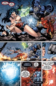 PANEL 1: Good thing Jim Lee put those jumplines on this panel, otherwise I would have never guessed that Wonder Woman “jumped” off of Darkseid and landed on the pile of wreckage there. Speaking of lines, here comes The Flash and his speedlines. Looks like he and Aquaman are doing the Tango – “right foot, left left, right, left”