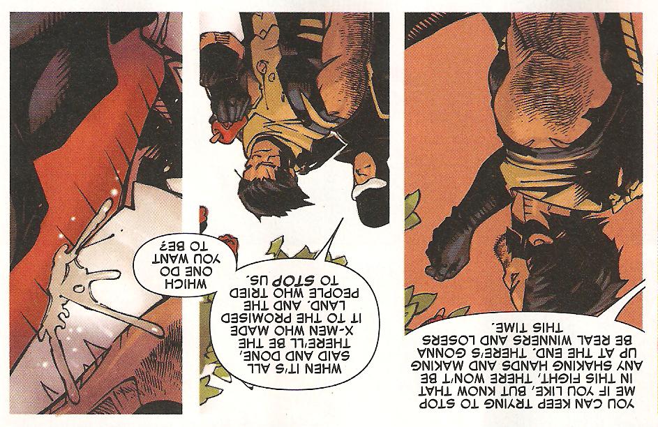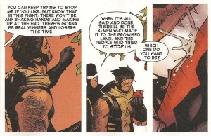 On the topic of draws, however, is a great piece of conversation between Cyclops and Wolverine in this week’s third and final tie-in, Jason Aaron’s Wolverine and the X-Men 10. “There’s gonna be real winners and losers this time.” That’s a great thing to see in print, especially from the guy running the show on this event. Nobody gets excited about a tie. Except European soccer fans. Although I suppose seeing the future of Hope resting on a series of penalty kicks might be fun. Who would each side elect to tend goal?