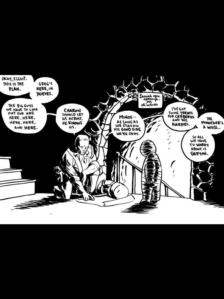 Zander’s talent for storytelling, pacing, and comedic subtlety is as good as ever. The layouts and styling of Heck, however, are different from what I remember of his earlier work: more panels; simpler, but more expressive, illustration. There’s a Tom Hart / James Sturm influence that, together with a beautiful use of stark black and white, creates full-page sequences that are dense but engaging. That’s where digital tools suffer though: in order to make it readable on your device, you’re probably going to opt for comiXology’s guided technology, which flows through the story a few panels at a time. Although you can choose to view an entire page, the size becomes problematic. One more reason to buy the collected edition in the future.