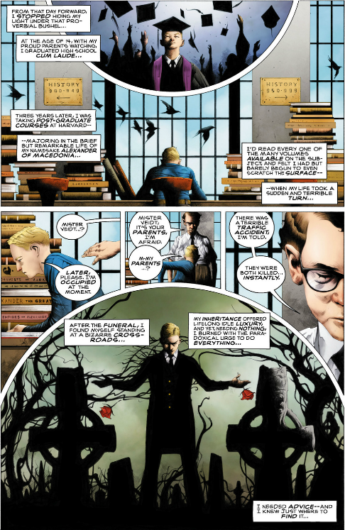 That grain of sand continues to fall into the next page here, with the circle at the top of the page, representing the passage of time during Veidts travels. We also learn here on this page that in Memphis they proclaimed Alexander “Son of Amon” “, judge of the dead, whose name means “the hidden one”. This is Adrian Veidt in a nutshell.