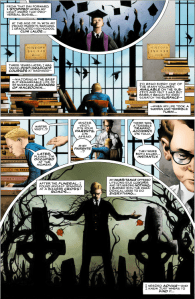 And let’s just get this out of the way here in the first page, Jae Lee’s art on this issue….. spectacular. I could go on for days about the work Lee has accomplished in this issue, but let’s just say that it is fucking beautiful art and this issue is a must read because of that fact alone. This first page is an indicator of things to come in this issue. Lee’s use of squares, rectangles, and circles instill a sense of order and perfect construction of Veidt’s word. Most of the panels are a “head-on” shot, again giving us a sense that everything in Veidts world is straightforward, like a horse with blinders on – he has no desire to view the world from any other angle.