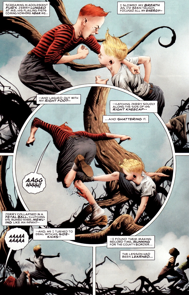 Jae Lee uses the same panel layout as page 3 – with the circle being the prominent shape – that page also featured Adrian’s parents as well. The circle is less harsh a shape then the square, softer, more open. Veidt tells us that the beatings by Jerry lasted for months, everyday at lunch. It seems unlikely that Adrian’s dad would allow this to take place for so long and not intervene. but maybe his son had more influence over him then he realized.