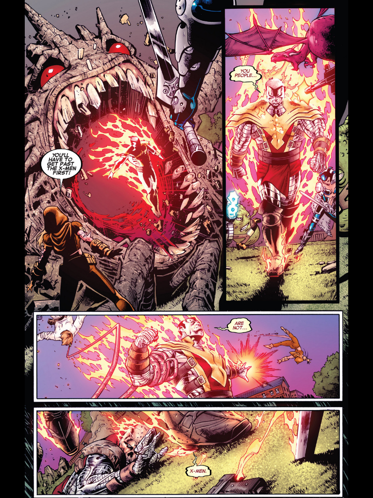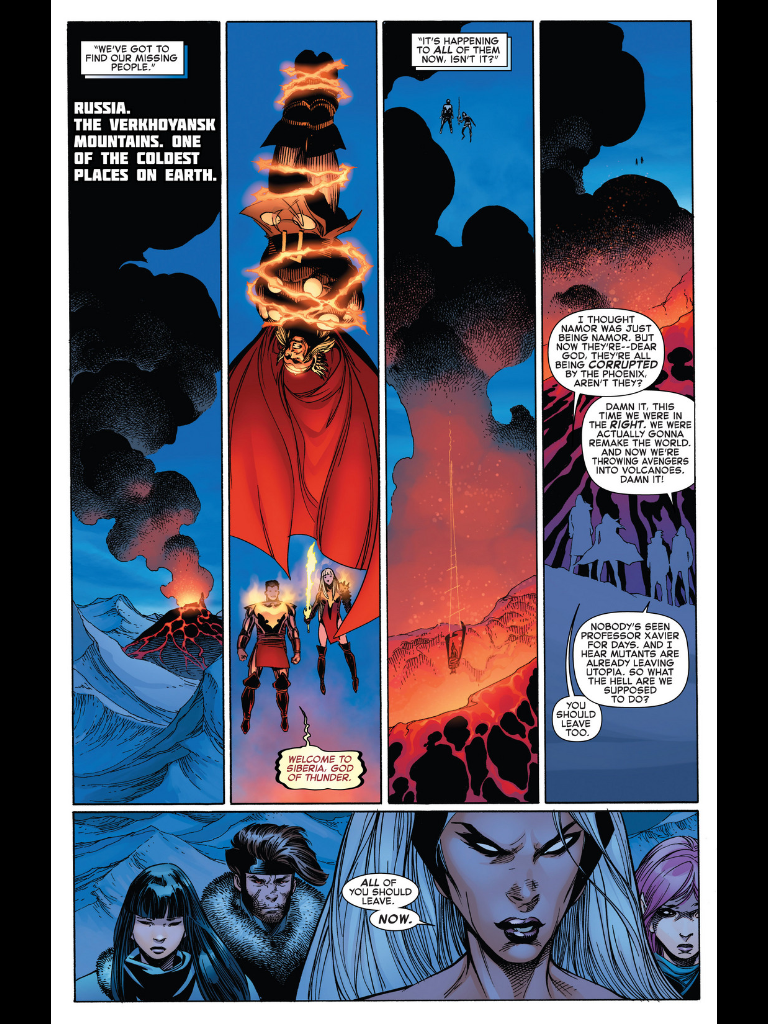 AvX should be great… for all those reasons. Too many cooks, though, I suppose… The Hope/Scarlet Witch/Phoenix/Iron Fist intrigue should be more compelling; save the blunt trauma beatdowns for the Vs. tie-in. Somehow, however, we’re still treated to page after page of “whose blood is this” mid-fight introspection. Give us more cosmic intrigue. More deft superpowered strategizing. Hell, at this point, I’d even be down with a closer look at Frenzy Saves Africa. But Act II closes with more running and more fighting (granted, on a grander scale: “Wakanda gets trashed” should have been a scoring option), and Act III opens with a Spider-quip strong enough to take down half of the Phoenix Four.
