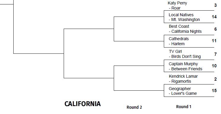 We’re looking at the bottom half of the California bracket, starting with Katy Perry [RF: “Katy Perry totally deserves a spot on this list… and “Roar” will be her single.”] She mixes it up with the Local Natives and “Mt. Washington” off of the Hummingbird LP.