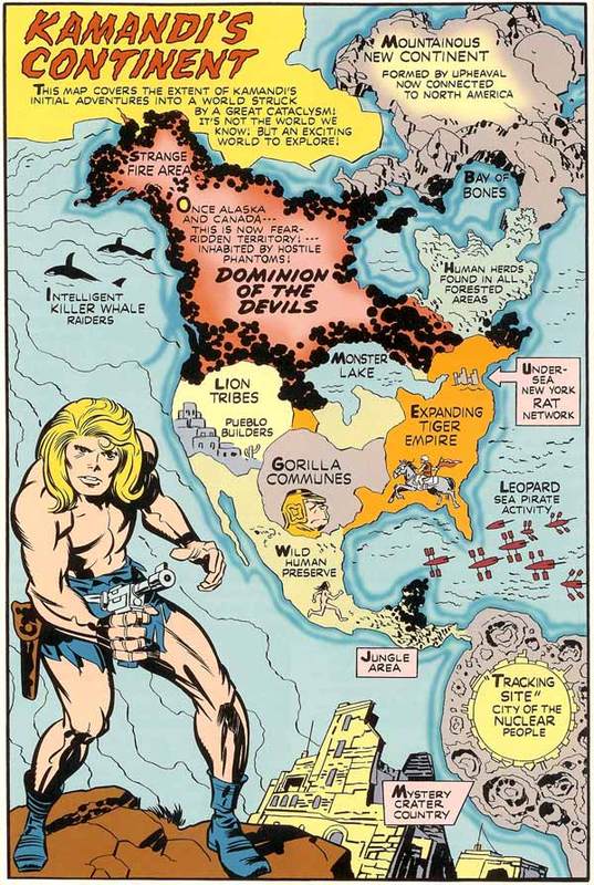 None of that is meant to diminish Kirby as a writer, of which he remains one of the best. As an artist though, Jack Kirby is the single most influential, visually engaging, and fun to have ever drawn a comic book. Of course that is just my humble opinion, but I hope that Kamandi acts as sufficient evidence on Kirby’s behalf. Take for instance this map, which shows the world in which Kamandi lives.