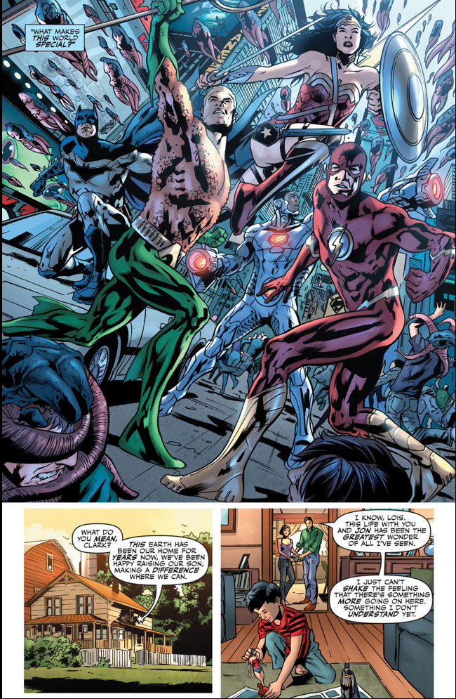 That’s a lot to cram into 22 pages. Oh, and there’s a giant techno-organic space beasty invading the city (more Watchmen-crossover hints?) attempting to harvest the populace. And because that’s a lot to tackle, the comic stumbles a bit. Not to give away too many spoilers, but there is a climactic everybody-shoot-at-once scene inside the creature that would feel lazy even in a Saturday morning Super Friends episode. Not to mention that it isn’t at all clear where they are when the guns are blazing (or still trapped inside its tummy when it flees the atmosphere?) It’s a super-team book, and that’s a tough dynamic to iron out. When you’re tasked with tidying up a complete story that involves a major extinction-level threat in the confines of one issue, then you’re going to deal with some wrinkles.