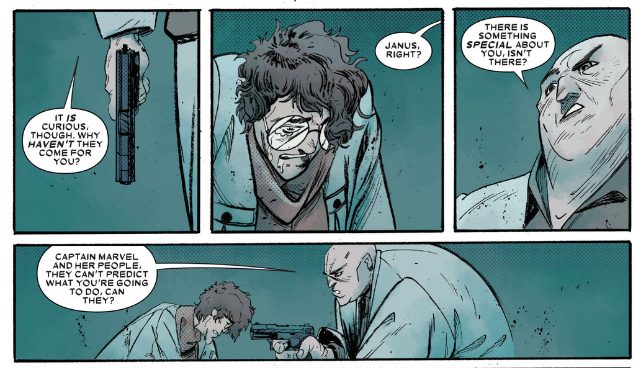 What the hell are Captain Marvel and the Avengers doing hassling two-bit Manhattan crooks like Fancy Dan and Man Mountain Marko? Clearly, they’ve been getting their money’s worth out of that Inhuman with the prognosticating powers. So how is a Kingpin of Crime supposed to get stuff done? Enter Janus Jardeesh (cleverly named after the Roman god of time), a shitheel of a lackey who also happens to have a latent Inhuman gene. And after he stumbles through terrigenesis, Janus becomes Fisk’s new secret weapon.