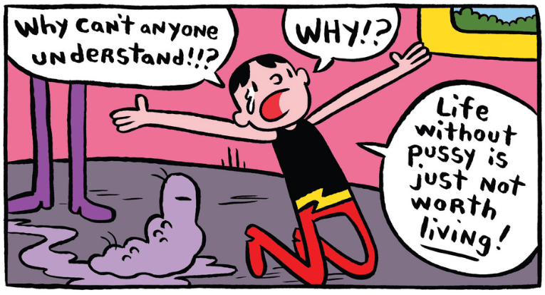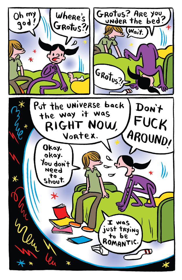 Kochalka’s prolific output over the last few decades has included everything from autobio-elfical diary entries to kids comics. And whether blessed with his vibrant, kinetic color palette or in black & white, his signature linework combined with a deft, straightforward humor has always made me smile and, oftentimes, laugh out loud. This series reminds me of all the absurd and wildly inappropriate comics I used to scribble all over my high school notebooks. Except, you know. Way better.