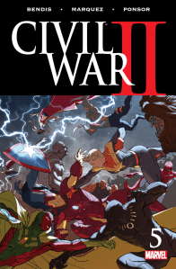 We’re in the penultimate week of Marvel’s ANAD, Year One, and the dramatic clash between the divided camps of superheroes at the center of Civil War II #5 feels like major set-up for the Marvel NOW era that kicks off at the beginning of October. Unfortunately, it’s also starting to feel a little overwrought. Star-Lord, in battle with Iron Man, practically shrugs and cops to fighting each other “just because.” Editorial mandates driven by demands for Hollywood tie-ins may be to blame for Bendis phoning in the last few chapters of this event. Which is a shame, really, because the premise was solid, and the support books – Iron Man and Captain Marvel’s solo titles in particular – have done a much better job at debating the merits of preventative justice. So far this book is lots of shock and little substance. But, oh yeah… there’s a nice shocker to close out this issue too. – MMDG