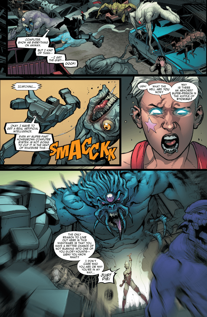 Although she was introduced during Bendis’s All-New All-Different Invincible Iron Man series, this book is a perfect introduction to Riri Williams, the super-genius teenager who has built her own flying suit of armor and, in a world without Tony Stark, is determined to make a difference. Accompanied by the beautiful artwork of Stefano Caselli (The Amazing Spider-Man, Secret Warriors), this first issue weaves Riri’s origin story into a present-day battle with Animax (who?) in Wyoming (what?) And it’s fantastic.