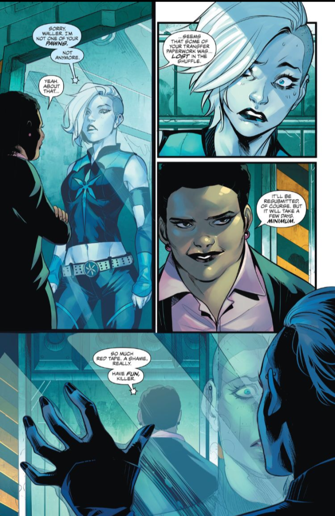While Belle Reve is not too exciting of a setting visually, it being a mega-maximum security despair hole, Mirka Andolfo’s character illustrations help liven up the comic. I have no beef with his character designs – Frost, Mr. Toxic, and Heatstroke all look awesome, but some pages are overstuffed with panels, conveying a lot of quick action, but also looking crowded. And I don’t know how funny Waller was supposed to come off in the book, but Andolfo frequently draws her yelling like a ticked-off sergeant in a renegade cop movie. I’d imagine Waller being more composed and cruel, and while the shouting gets her authority across, I think she looks kind of goofy.