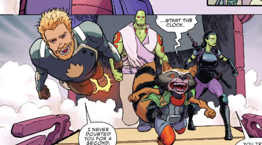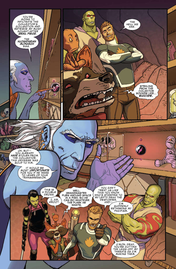 But I digress. The new book is tantalizing eye candy for both casual readers as well as longtime fans hungry for a return to form. The fact that Kuder is providing the art is almost good enough, by itself, for me to sign on for a full arc. Marvel fans may not be too familiar with his work, but his Frank Quitely-inspired artistry had been on display on various DC projects over the last few years. He’s found a welcome home on a major Marvel book, especially among those of us who wished Arthur Adams could have been doing more than just Guardians covers. There’s a mix of startling intricacy in his linework, but it’s combined with a fluid dynamism that not only complements the humor of Guardians, but also fits wonderfully with Marvel’s trippy cosmic legacy, from Steve Ditko through Jim Starlin. Also, thank you for restoring Drax and Gamora to their pre-movie designs.