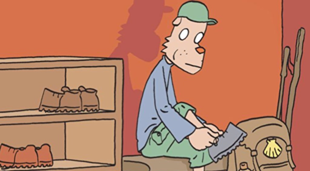 It’s charming to see Jason take conscious steps towards overcoming his unease, watching his imagination convert interactions and conversations into progressively more playful daydreams. As his disquiet diminishes, the profundity of his physical journey becomes clearer. As the days and pages tick by, Jason appreciates his surroundings more, and every little detail becomes more meaningful. From a tear on the cheek of a fellow traveler remembering her father, to the taste of a morning latte, or the late-night flashlit search through wet cobblestone streets for a goddam yellow arrow or scallop symbol to get back on the path, every moment contributes to the self-discovery.