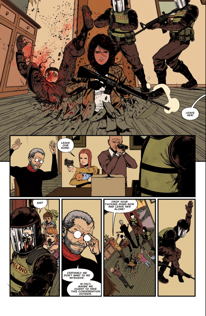 The result of their efforts, already on display in this first issue, is not only a carefully planned and plotted what-if scenario (think Brian K. Vaughan’s Y the Last Man or Brian Wood’s DMZ), but a helluva good action yarn. California is a battleground of occupied cities and revolutionary outposts. And in Los Angeles, Jamil, a courier/smuggler with a robotic avian personal assistant, is about to cross paths with Zora, an insurgency organizer who’s being hunted for, among other things, her immigration status.