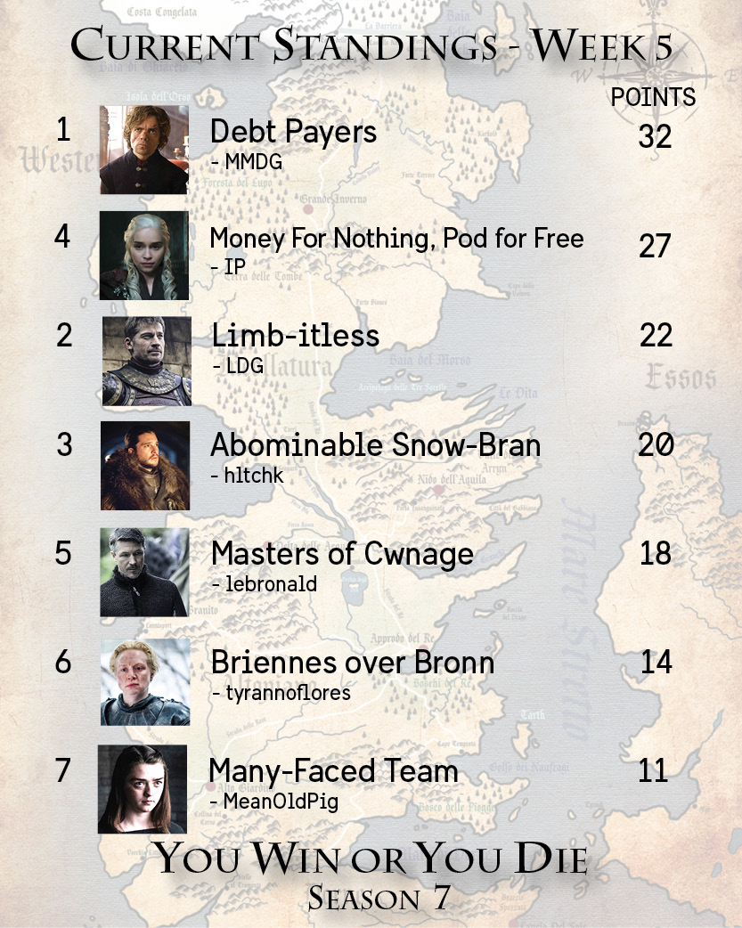 All it takes is a little dragonfire to make things a little more interesting. With both Randyll and Dickon burnt to a crisp, that brings Money For Nothing, Pod Free within striking distance of Debt Payers. Only two episodes left!