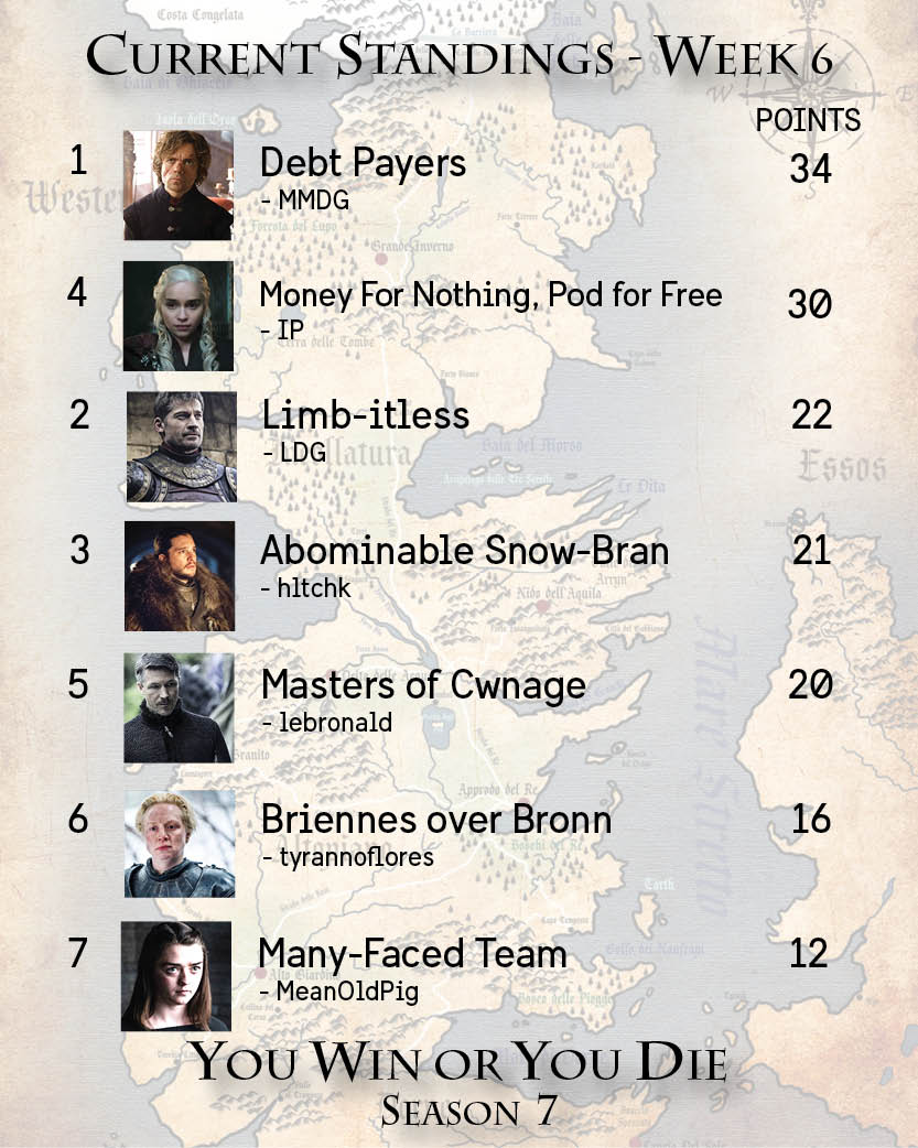 Hmmm, I think what this episode needs is, oh yes, more death. We did get a dead dragon though, and now it’s an undead dragon (gulp). Limb-itless lost two characters in this episode, although both Thoros and Benjen had barely shown up in the show or even at all in Benjen’s case, so not too much of a loss there. Unless there’s a big shakeup in the finale tonight, I don’t see how Debt Payers loses this one.