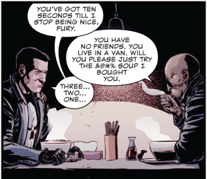 So there goes the Punisher, suited up in War Machine armor, off to do some dirty work for Nick Fury in a fictional eastern European nation that apparently is being run by war criminals and traitorous ex-S.H.I.E.L.D. operatives. And they kill kids. So let’s get gritty and blow more shit up.