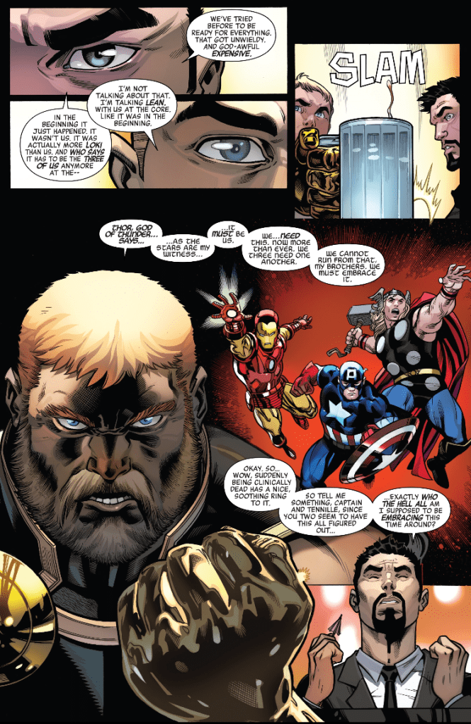 To call this new Avengers run one giant tribute to Jack Kirby really isn’t that much of stretch. In the present day, the three principals, all characters co-created by Kirby, are grabbing drinks and talking themselves into reforming the team. And they’ve all had a shit time of late: Cap hasn’t been an Avenger since his evil alter-ego took over the country in Secret Invasion; Tony is fresh out of the coma he’d been in since the end of Civil War II; and Thor, well, he’s still dealing with the fact that he’s been “unworthy” since Original Sin, and just had to deal with the death of Jane Foster. Kirby’s heroes have seen better days. They need each other as much as we need to see them back together.
