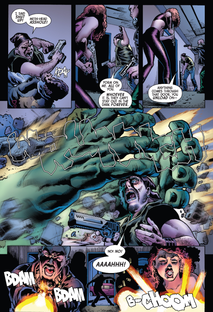 Joe Bennett makes the Hulk seem larger than life with his art. He’s always portrayed from weird angles and never contained to a single panel. The joy in his eyes while he critiques the criminal of the issue is really unnerving.