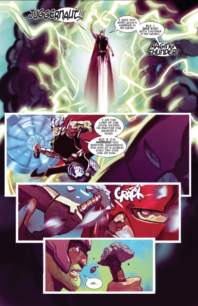 This is like the single-best issue of Heavy Metal in one Marvel comic book. It opens with the main story, illustrated by del Mundo, in which the newly restored Odinson (of questionable worthiness, and still missing a signature hammer), commanding the mantle of Thor once more, pursues a variety of dangerously powerful artifacts that are now scattered across Midgard following the Mangog’s obliteration of Asgardia. First obstacle, soldier and erstwhile avatar of the demon Cyttorak, the unstoppable Juggernaut.