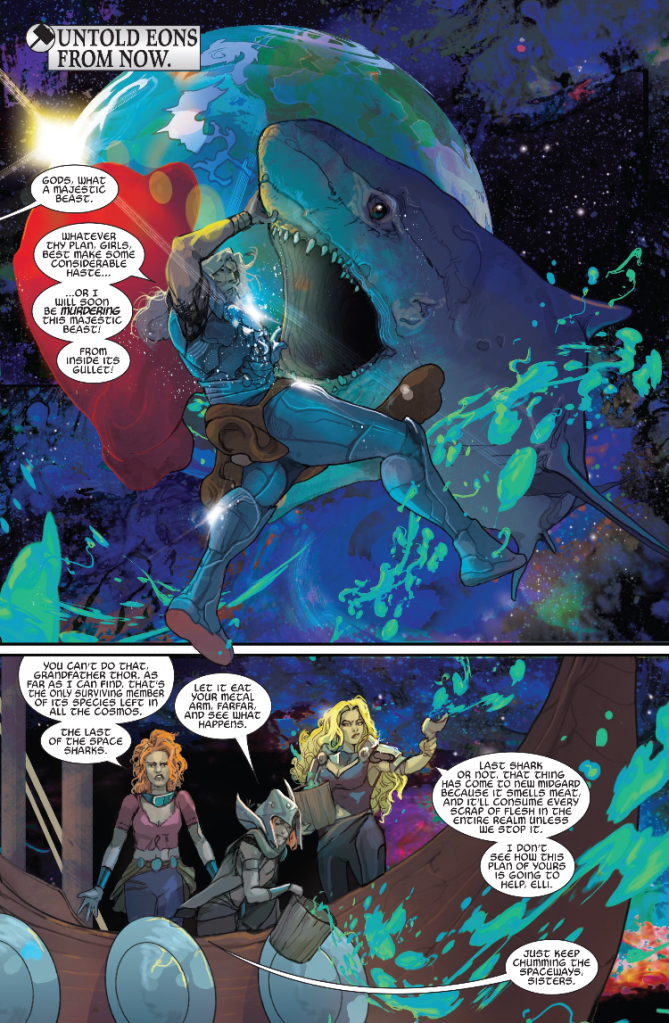 The book closes with the first part of an occasional backup feature. King Thor, eons from now, literally has his hands full. He’s got the last of the space sharks in his mitts, eager to chomp down on whatever flesh remains in the cosmos. He’s raising a trio of sassy granddaughters, the godlets of Thunder. And, oh yeah, the universe is dying. Journey into Mystery indeed! And goddam but can that Christian Ward light up a page!