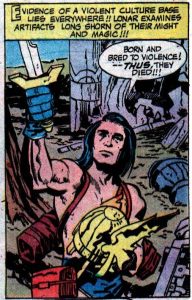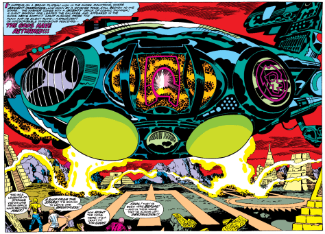 The working title for The Eternals was actually Return of the Gods, which even more clearly suggests that Kirby’s inspiration for the series included the pseudoscientific theories of Pauwels, Bergier, and Von Däniken. In an afterword to the first issue, Kirby expresses the creative genesis for the series rather clearly: “What did happen in those remote days of men’s early struggle for civilized status? What is the true meaning of the myths which shared a global similarity among diverse peoples? Did beings of an extra terrestrial nature touch down among us and influence our lives to this present day? And then, the all-important question of the lot — are these beings in some cosmic orbit which will lead them back to us someday?”