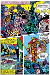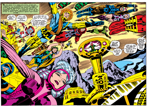 I can’t say that I completely agree with Charles Hatfield, the Kirby scholar who saw Marvel’s strict adherence to continuity in the 1970’s as a curbing of creativity. Like all great story worlds, whether tales of ancient Greek heroes or Dungeons & Dragons campaigns, there is great potential for growth and exploration when a variety of creators are given opportunities to build upon a foundation. It takes a little time — more than two years before the first threads are spun — but the stable of creatives working for Marvel in the subsequent decades make good use of Kirby’s Celestial storyline, weaving it firmly into the existing tapestry of the Marvel universe.