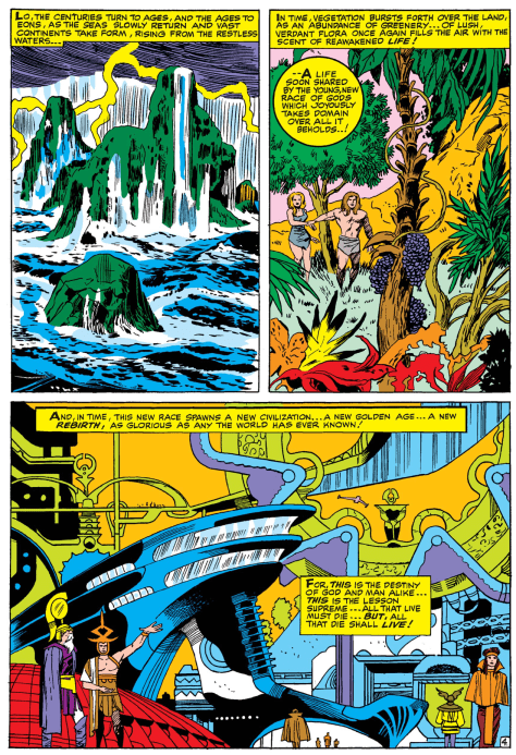 When it comes time to tell that story in Tales of Asgard, here narrated as a vision of the future rather than something happening within present continuity, we are introduced to another Kirby constant: the rise of new gods.