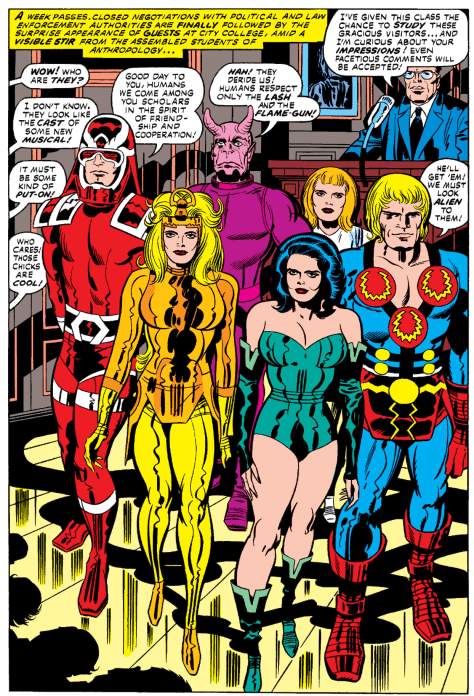 The latest in our series of Four Color Primers unravels the origins and development of The Eternals, with a special emphasis on Sersi, historically the most interesting and active of this band of demigods. The aim with these posts has always been to function as a character survey (hopefully less convoluted than your average Wikipedia article, albeit almost always more verbose) that puts a primary consideration on the historical progression of concepts and stories passing from one creative team to the next, rather than a strict fictional biography. This is especially pertinent for The Eternals, whose original conception places their origin a million years in the past, a timeline that has seen refinement and elaboration from numerous writers and artists since Kirby first introduced us to the group in 1976.