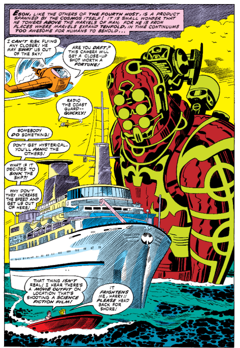 Kirby had enjoyed a good deal of autonomy at DC, and even though his ideas for the Fourth World saga would go on to become critical building blocks in DC’s developing universe, Jack was still able to tell his stories the way he wanted. He must have been promised a similar degree of independence upon his return to Marvel; his Captain America run is famously problematic, and The Eternals, from its opening issues, was very clearly intended to exist outside of the Marvel universe. We’ll see a Deviant horde masquerading as Biblical demons setting fire to New York City… and apparently the only super-powered folks on hand to oppose them are a handful of Eternals. Reference is made to characters like The Thing and Doctor Doom as though they are nothing more than fictional comic book characters.