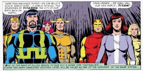 Chronos becomes one with the universe. He is now the cosmic entity known as Kronos. Zuras, now grown, is chosen to lead the Eternals on Earth. He’s the same Zuras we know to be the Prime Eternal from Kirby’s series. A’lars, convinced that his destiny lies among the stars, takes a contingent of Eternals into space, where he soon discovers the settlement once established by his uncle Uranos on Saturn’s moon Titan, and fathers two children of his own, Eros and Thanos.
