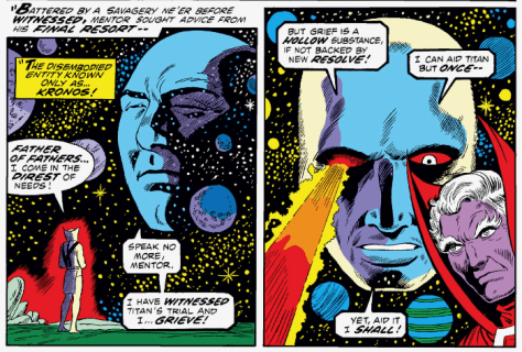 All of this connects back to the work of another master of cosmic space opera, the early Marvel work of one Jim Starlin. In 1973’s Iron Man #55 he introduces us to Kronos, Mentor (otherwise known as A’lars), and Mentor’s sons Eros (later to be known as the Avenger Starfox) and Thanos (yes, that Thanos).