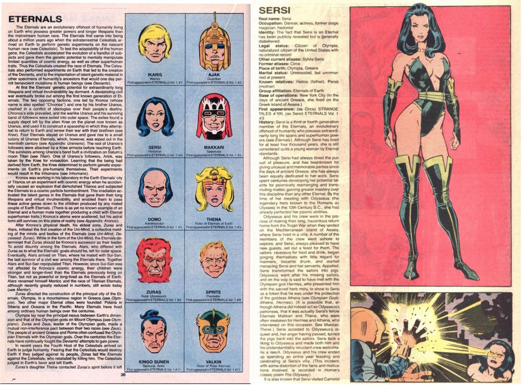 Interestingly enough, as the late great Captain of Continuity Mark Gruenwald points out in the aforementioned Handbook of the Marvel Universe, if we believe that the Circe of myth was a real person in the Marvel universe, and she was actually Sersi the Eternal… then her first appearance actually happened more than a decade earlier.