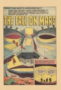 A year later, a strip for Race for the Moon #2 entitled “The Face on Mars,” likewise involves human explorers uncovering the extraterrestrial origins of an ancient monolith, this time a colossal face on the Martian surface (almost two decades before the celebrated “face on Mars” photos of Mars’s Cydonia region taken by the Viking orbiters). Many of Kirby’s stories in the 1950’s, whether full-length tales in a monthly like DC’s Challengers of the Unknown or stories in anthologies like House of Mystery or pre-superhero Tales to Astonish, featured similar narratives of alien machinations or giant statues of seemingly inexplicable origin.
