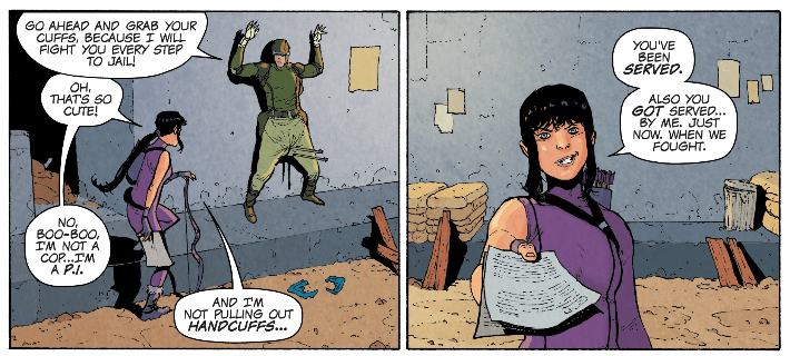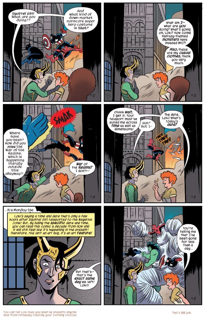But let’s compare this book to Unstoppable Squirrel-Girl #43 by Ryan North and Derek Charm. The chemistry between writer and artist is fantastic, as you’d expect on a book replete with timely dialogue zingers, well-crafted sight gags, and layers of meta-humor. The page is the thing, dear players, and a simple glance at how well these two work together is on display during a conversation between Colleen and Loki, tucked into an NYC alleyway while the superheroes tackle a host of frost giants.