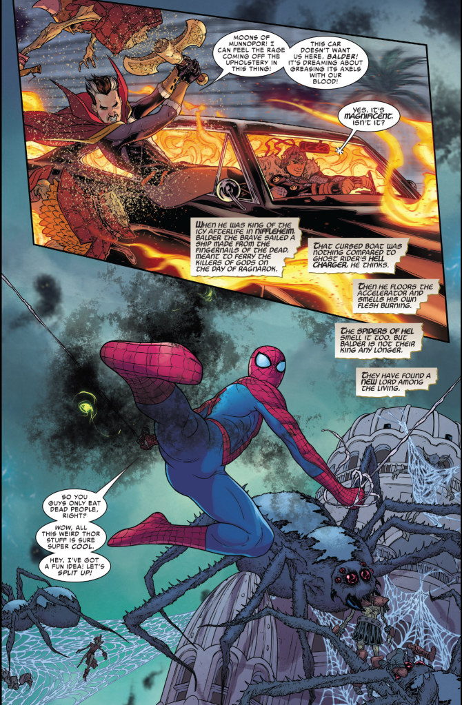 So then, this week, I’m reading the latest installment in the main book, War of Realms #5, the penultimate chapter in Jason Aaron and Russell Dauterman’s epic fantasy/superhero explosion. And I’m thinking… when the hell did we get to South America and what the fuck is the Enchantress doing with an army of the dead… But instead of complaining about linearity, I am treated to Doctor Strange leaning out the window of Ghost Rider’s Hell Charger, piloted by Balder the Brave, while the Sorcerer Supreme plays mailbox baseball with Asgardian zombies. Cool. I’ll buckle in. I don’t know where we’re going, but this is definitely all about the ride.