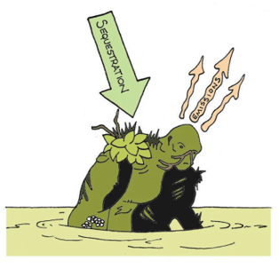 Despite doing his best to sequester carbon dioxide from the atmosphere, Swamp Thing may actually be releasing excess amounts of this greenhouse gas (which is 30x more harmful than CO2), a common by-product of microbial growth in oxygen-poor environments such as, well… swamps.
